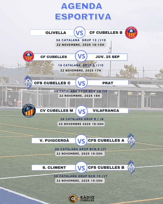 Les entitats esportives de Cubelles encaren un cap de setmana carregat de competició, amb partits repartits entre dissabte 22 i diumenge 23 de novembre de 2025. Futbol, futbol sala, voleibol, bàsquet i hoquei configuren una agenda molt completa per als clubs del municipi.