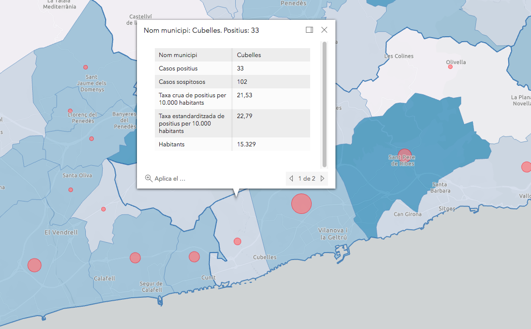 A la comarca del Garraf en total hi ha ara 538 positius confirmats (+12) i 1.309 casos sospitosos de tenir la COVID-19, amb una taxa d'uns 35,6 casos per cada 10.000 habitants. En les dades per municipis, el més afectat en quantitat és Vilanova i la Geltrú amb 253 positius confirmats (+1), 607 sospitosos (+25) i una taxa de 37,7 casos per cada 10.000 habitants. En proporció a la població, però, és Sant Pere de Ribes el municipi de la comarca amb més contagis. Concretament hi ha 168 positius confirmats (+6), 307 sospitosos (+10) i una taxa de 54,6 casos per cada 10.000 habitants. A Sitges sumen 72 positius (+4), 233 sospitosos (+8) i 24,5 casos per cada 10.000 habitants. Al municipi veí de Cunit (Baix Penedès) el nombre de positius és de 53 persones (+3), hi ha 221 sospitosos (+37) i una taxa d'un 40,9% per cada 10.000 habitants.