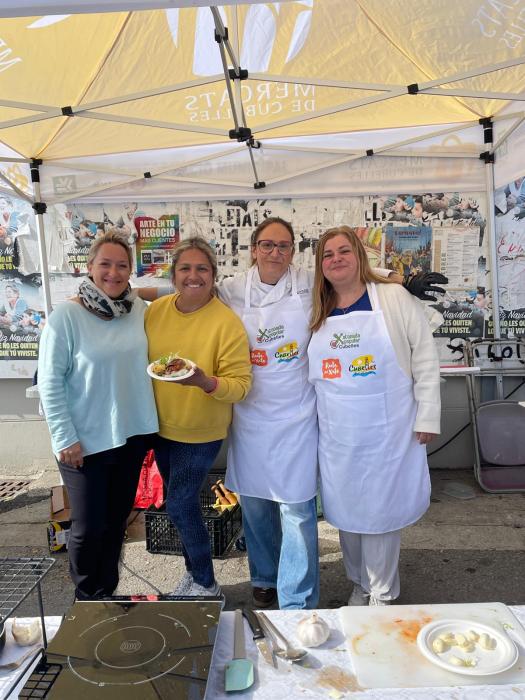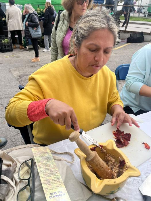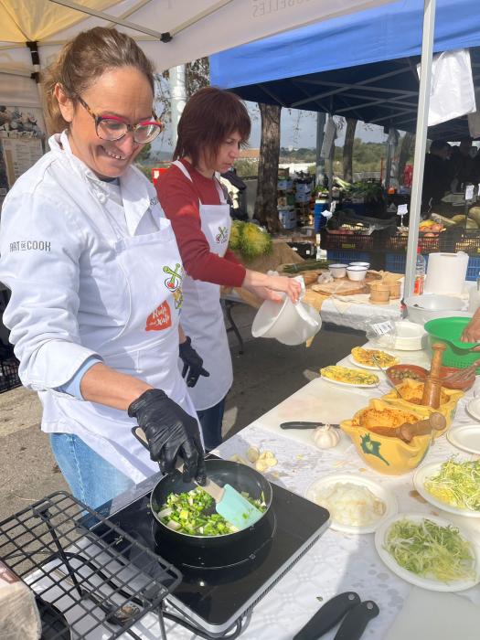 L’activitat s'ha realitzat amb productes adquirits al mateix mercat, reforçant el comerç local i destacant la qualitat dels aliments frescos i de temporada. Com a part final del taller, les participants han elaborat i repartit una vintena de racions de xató acompanyat de truita, que han estat degustades per les persones assistents.