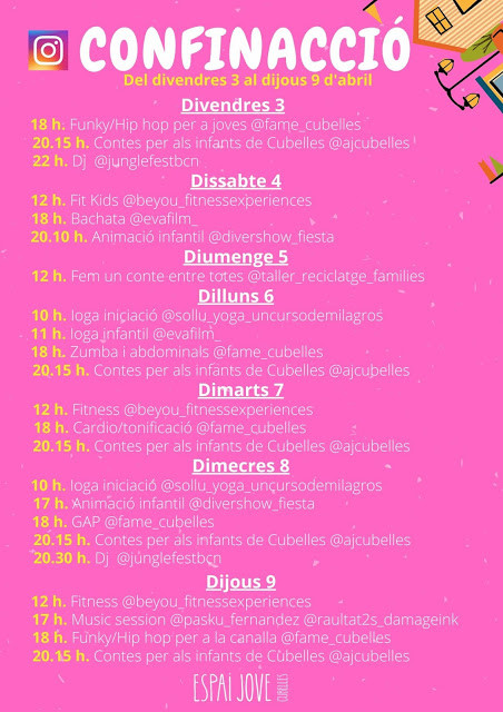 Les activitats de la segona setmana del Confinacció van començar el divendres 3 d'abril i seguiran fins el dijous 9 d'abril. És una iniciativa que pretén agrupar diverses propostes que fan els usuaris a les xarxes socials. Al cartell d'aquest segon confinacció s'hi poden trobar fins a 23 activitats en 7 dies, amb actuacions de tota mena, concerts musicals, classes de ioga, fitness a d'altres tipus d'entreteniment. L'Espai Jove és qui s'encarrega de coordinar la programació d'activitats cubellenques que es poden veure en directe des d'Instagram. Com la setmana passada, l'objectiu és ajudar en especial al col·lectiu de persones més joves, a distreure's realitzant activitats des de casa a través de les xarxes socials.