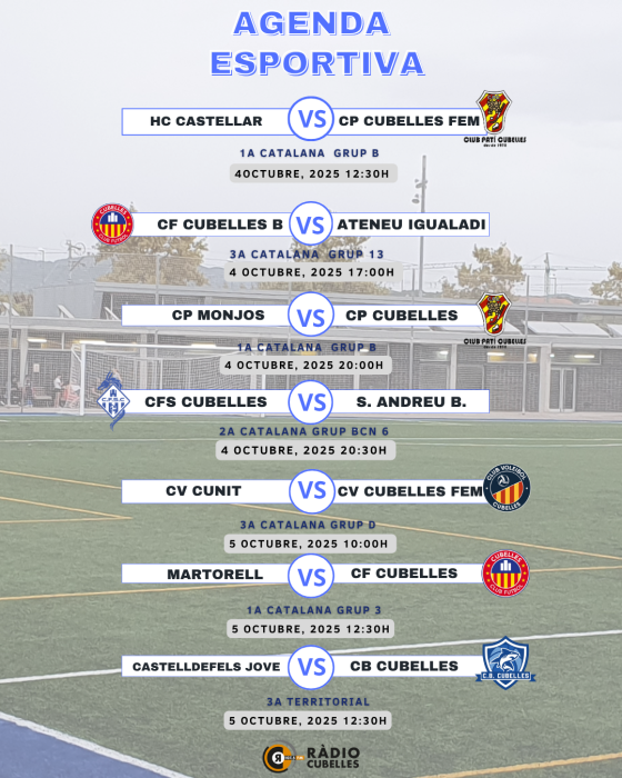 Una de les estrenes arribarà dissabte al vespre amb el debut del CFS Cubelles a la Segona Catalana. El conjunt s’estrena a casa, al Poliesportiu, davant el Sant Andreu de la Barca (20:30h).