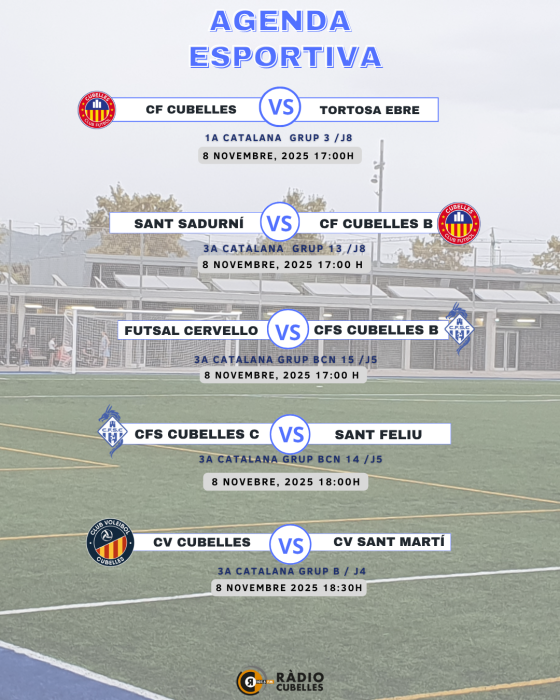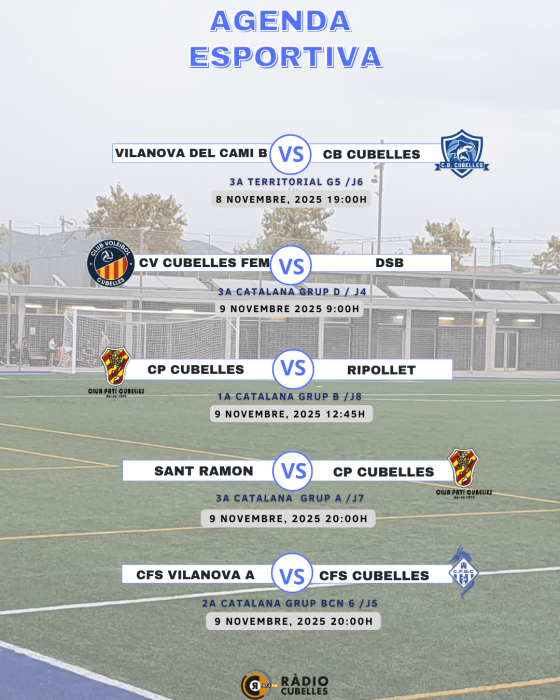 Aquest cap de setmana, els equips esportius de Cubelles tenen una agenda ben plena, amb una desena d’enfrontaments repartits entre dissabte 8 i diumenge 9 de novembre. El futbol, el futbol sala, el voleibol, el bàsquet i l’hoquei patins seran protagonistes d’una nova jornada de competició per als clubs locals.
