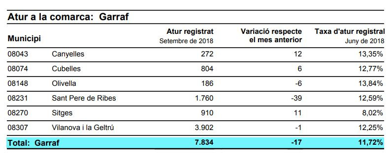 Pel que fa a la comarca, en conjunt l’atur s’ha reduït lleugerament en 17 persones. Hi ha diversos municipis que, com Cubelles, han vist incrementada la xifra d’aturats. L’ascens d’aturats a Canyelles ha estat el més alt del Garraf i proporcionalment el més important. L’atur també ha pujat a Sitges, tot i que és el municipi amb la taxa més baixa de la comarca. En canvi, Sant Pere de Ribes, Olivella i Vilanova i la Geltrú han vist com l’atur ha baixat. En total, al Garraf ara hi ha més de 7.800 persones a l’atur.