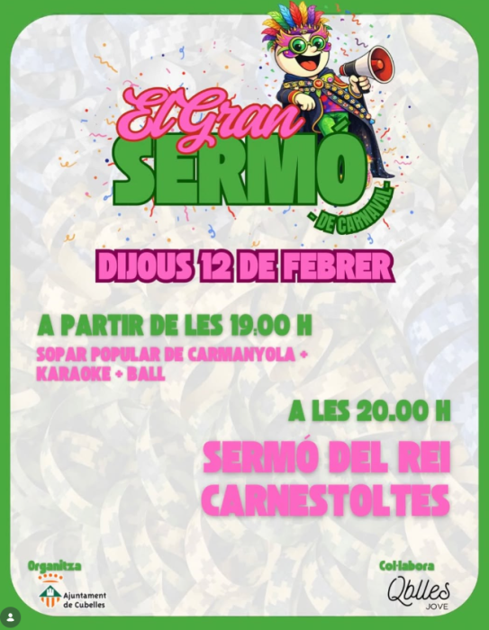 El sermó del Carnestoltes de Cubelles torna aquest 2026 a mans d'una associació: Qbelles Jove. Aquest any es recupera el format estrenat l'any passat, el dijous gras al vespre a l'envelat municipal. La novetat és que darrere l'acte hi haurà una entitat del municipi, enlloc de la regidoria de Cultura de l'Ajuntament. Un dels membres de Qbelles Jove, David Madrigal, ha revelat que serà un sermó molt diferent dels que s'han fet mai a Cubelles. Com sempre, el rei Carnestoltes repassarà amb un to satíric i humorístic l'actualitat de Cubelles i la seva gent. El seu regnat s'estendrà també a dues de les escoles de la vila i tindrà presència a la rua del dissabte.