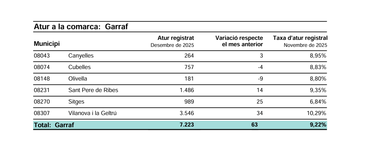 Les xifres d’atur del conjunt de la comarca a diferència de Cubelles mostren una crescuda lleugera durant l’últim mes de l’any. Concretament, al Garraf ara hi ha 63 aturats més, que sumen un total de 7.223. Malgrat el creixement mensual, en comparació amb el 2024 hi ha unes 250 persones menys registrades a l’atur.