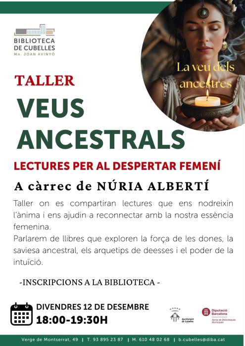 La Biblioteca Municipal de Cubelles organitza per aquest divendres 12 de desembre de 2025, de 18 a 19.30 h, el taller “Veus ancestrals”, una proposta íntima i vivencial a càrrec de Núria Albertí. L’activitat convida les participants a reconnectar amb la pròpia essència femenina a través de lectures, diàleg i petites pràctiques creatives. En una entrevista a Ràdio Cubelles, Núria Albertí ha parlat del taller 'Veus ancestrals'.