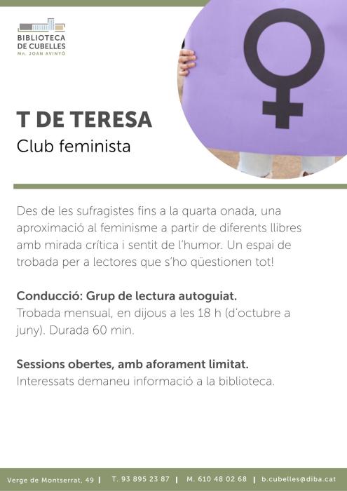 La trobada, conduïda pel grup de lectura no dirigit, s’emmarca en un espai de reflexió que, sota el lema “Des de les sufragistes fins a la quarta onada”, proposa una aproximació al feminisme a partir de diferents llibres, amb mirada crítica i sentit de l’humor. Es tracta d’un punt de trobada per a lectores amb esperit inquiet i ganes de qüestionar-ho tot. El Club T de Teresa porta aquest nom en referència a Teresa Mañé.