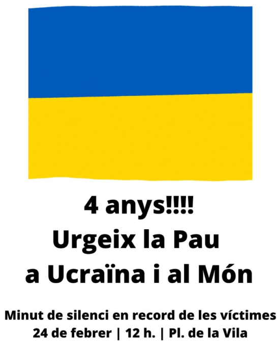 Aquest dimarts, 24 de febrer, a les 12.00 h, la plaça de la Vila acollirà un minut de silenci en record de les víctimes de la guerra d’Ucraïna, coincidint amb el quart aniversari de l’inici del conflicte.