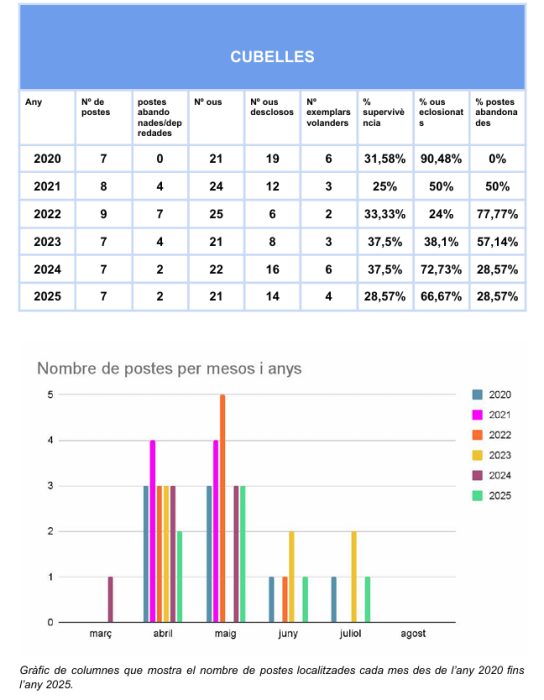 L’època de nidificació i criança del corriol camanegre va començar al març i s’ha allargat fins a l’agost. Ara, un cop analitzades totes les dades recollides aquests mesos, el GEPEC, l’entitat que s’encarrega de vigilar el corriol camanegre a Cubelles i altres municipis dels voltants, ha elaborat la memòria on deixa constància que aquest 2025 ha detectat set nius, dels quals dos van ser abandonats. Les parelles van pondre fins a 21 ous, 14 dels quals van descloure amb pollets. Finalment, quatre dels pollets han arribat a l’etapa juvenil i han pogut volar.