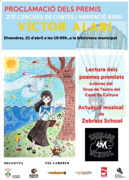 El divendres 21 d'abril, a les 19.00 h., la Biblioteca Municipal Mn. Joan Avinyó acollirà l'acte de Lliurament de premis del 27è Concurs de Contes i Narració Breu Víctor Alari 2023. L'obertura de l’esdeveniment anirà a càrrec del grup Zebrass School, que amenitzarà tota la gala. Mentre el Grup de Teatre del Casal de Cultura farà la lectura dels poemes premiats.